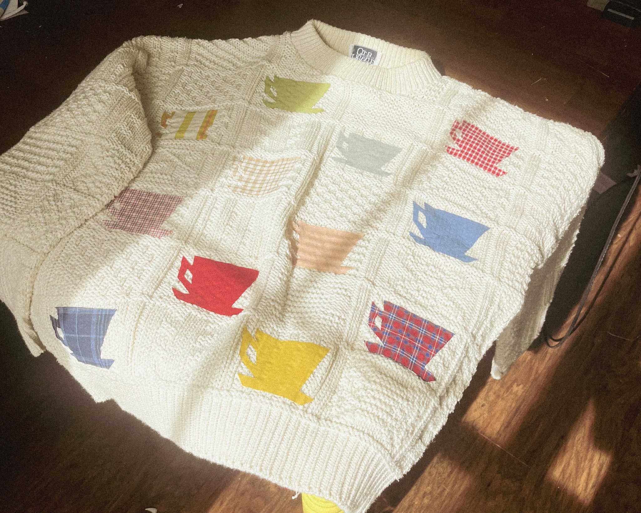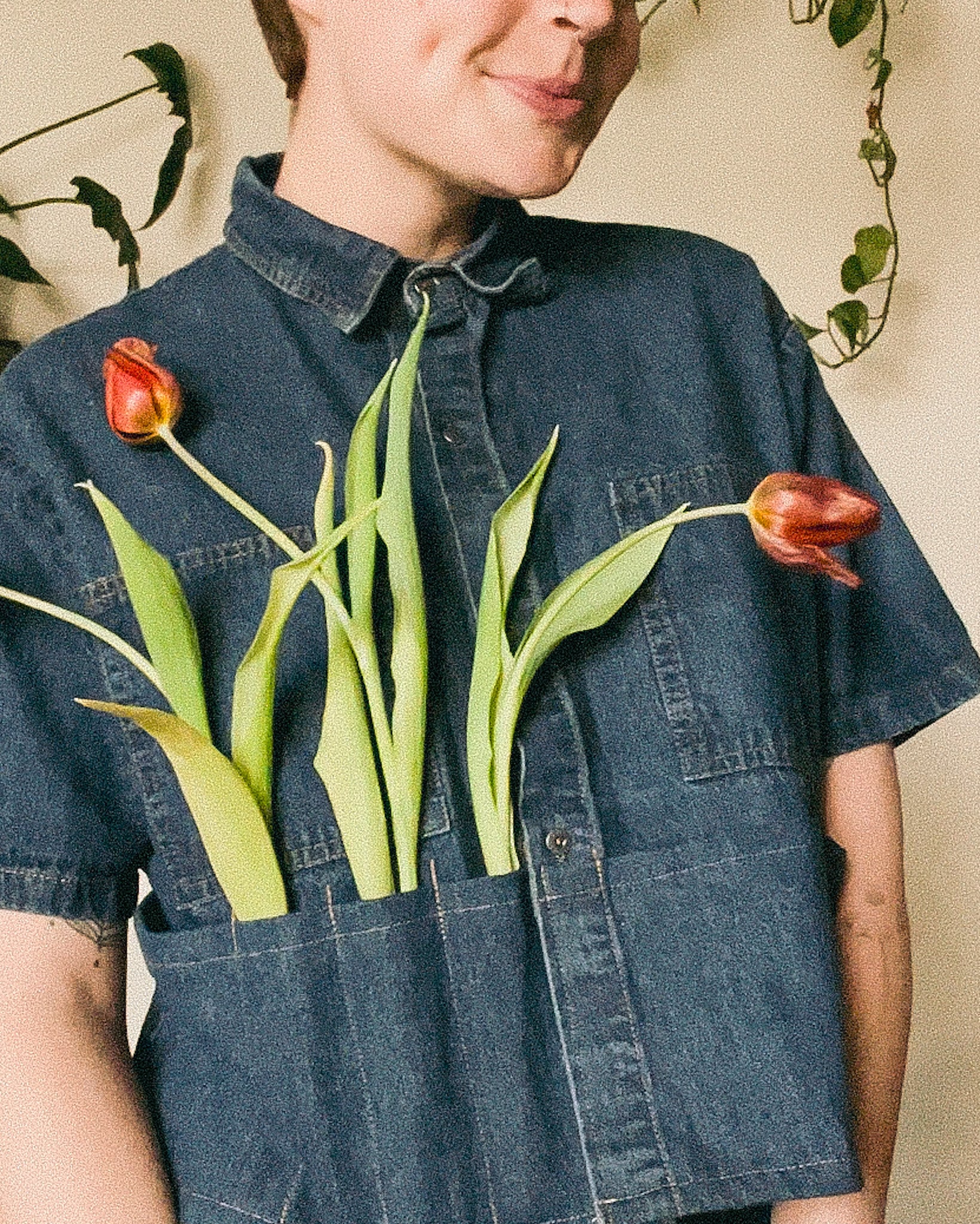 Each piece is a one of a kind statement carefully crafted from secondhand material. I source fabric and apparel from local thrift stores where I then dye, alter and sew the piece to fit my vision. The last step is printing with hand carved stamps and stencils to create a unique composition of wearable art