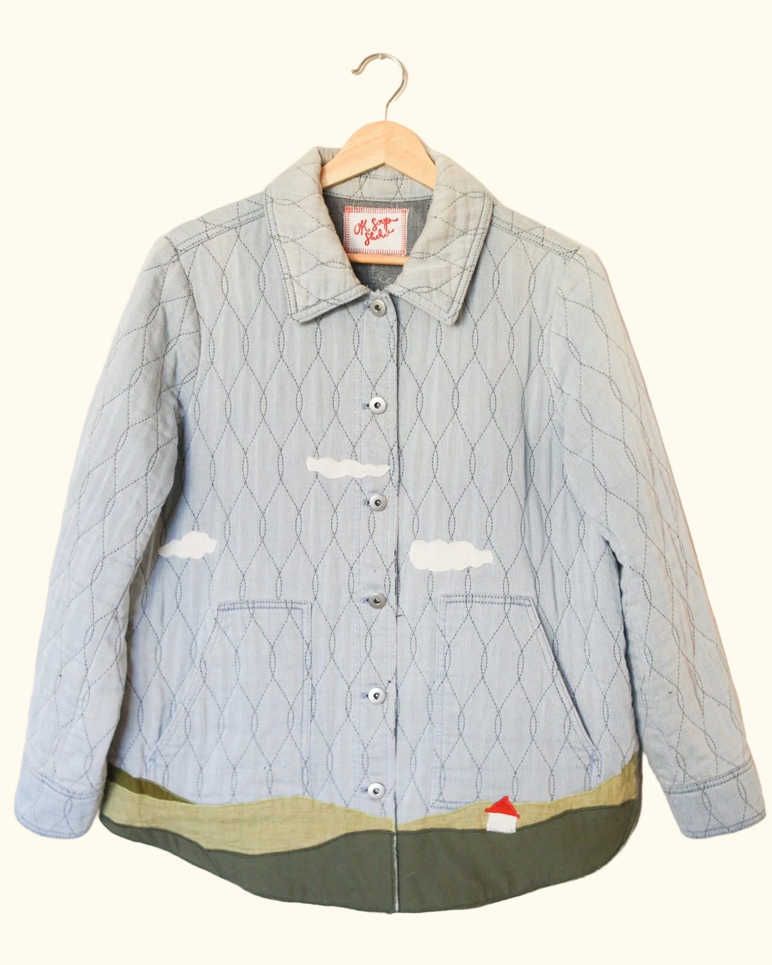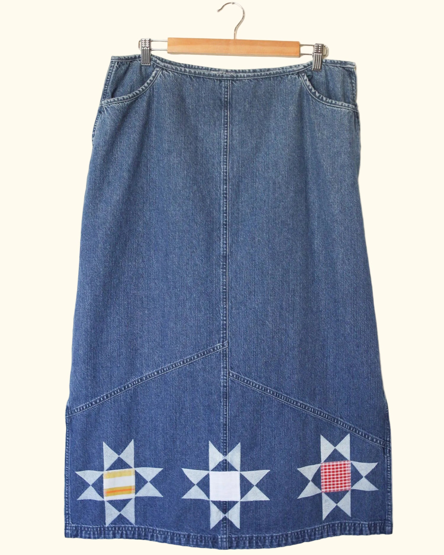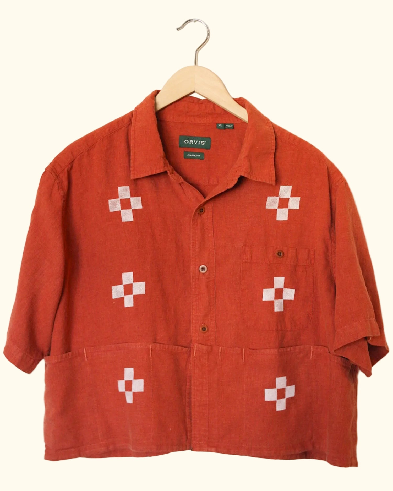 Each piece is a one of a kind statement carefully crafted from secondhand material. I source fabric and apparel from local thrift stores where I then dye, alter and sew the piece to fit my vision. The last step is printing with hand carved stamps and stencils to create a unique composition of wearable art