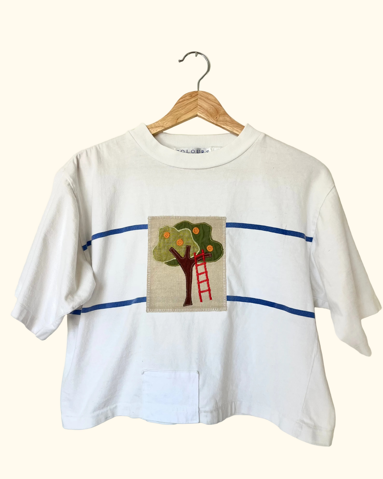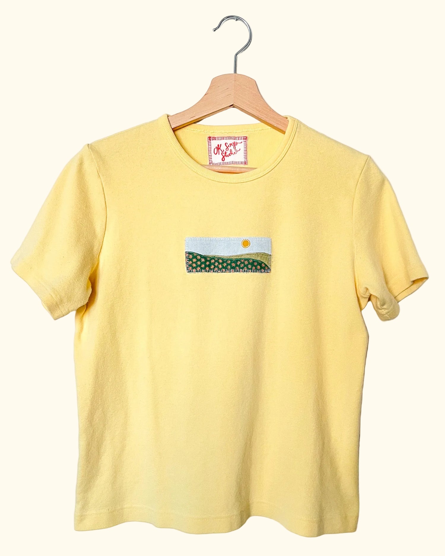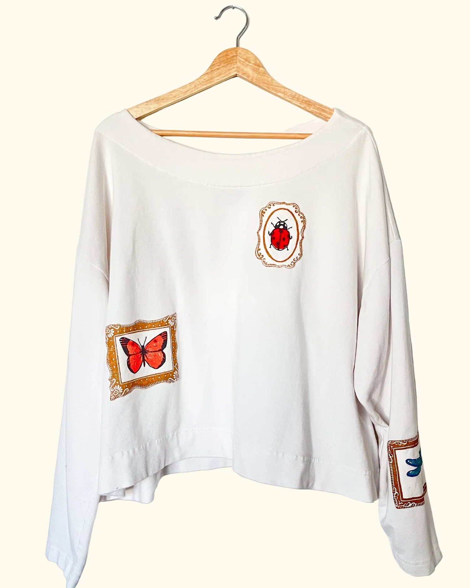 Each piece is a one of a kind statement carefully crafted from secondhand material. I source fabric and apparel from local thrift stores where I then dye, alter and sew the piece to fit my vision. The last step is printing with hand carved stamps and stencils to create a unique composition of wearable art